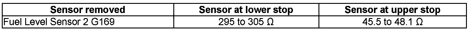 - With Fuel Level Sensor 2 G169 removed, the following values are obtained because of the greater deflection of the floater arm.