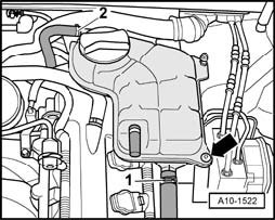 - Disconnect electrical wiring from Engine Coolant Level (ECL) Warning Switch -F66- and set aside coolant reservoir with coolant hoses - 1 - and - 2 - connected.