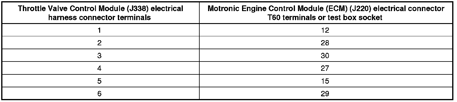 - Using a Multimeter, check the Throttle Drive (for Electronic Power Control (EPC)) (G186) at Throttle Valve Control Module (J338) electrical harness connector terminals to the Motronic Engine Control Module (ECM) (J220) electrical harness connector T60 terminals for an open circuit according to the wiring diagram.
