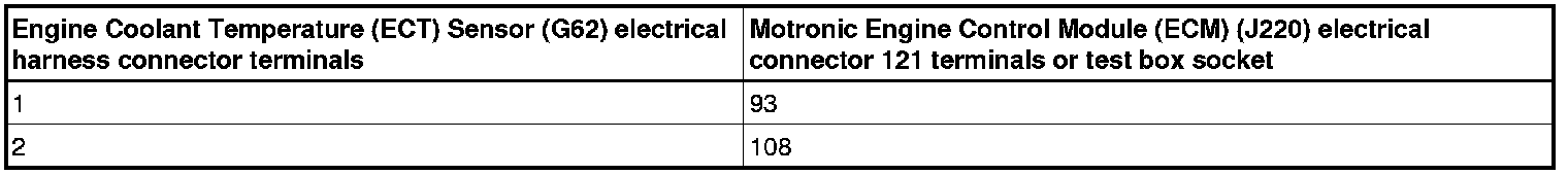 - Using a Multimeter, check the Engine Coolant Temperature (ECT) Sensor (G62) electrical harness connector terminals to the Motronic Engine Control Module (ECM) (J220) electrical harness connector T121 terminals for an open circuit according to the wiring diagram.