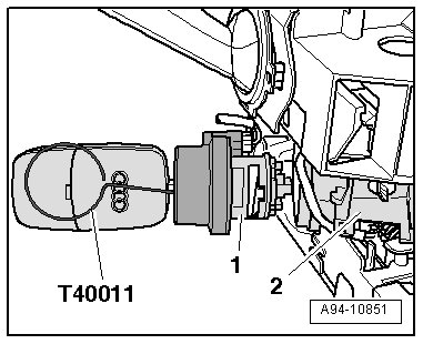 - Insert the (T40011) all the way into the hole and remove the lock cylinder - 1 - with the induction coil from the steering lock housing - 2 -.