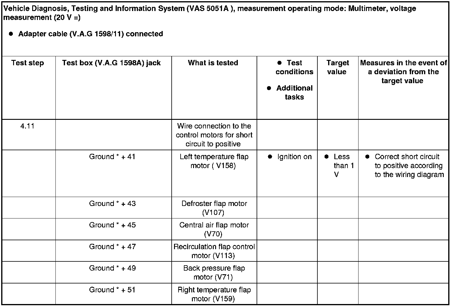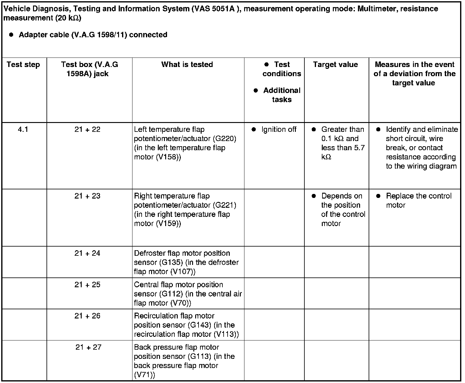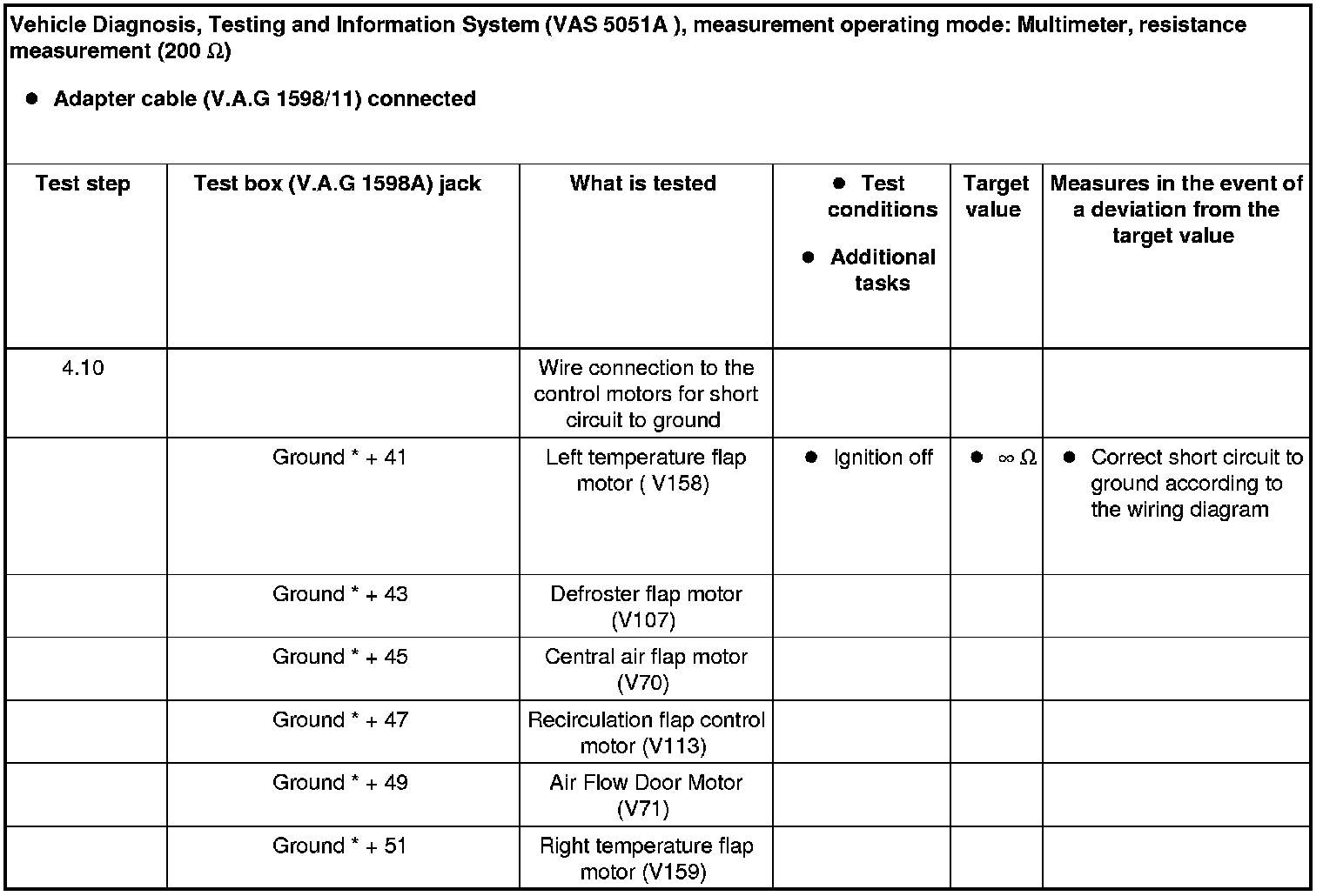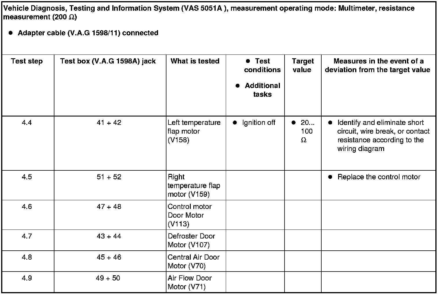 • If several control motors are simultaneously displayed as faulty in the DTC memory but no fault can be identified in test step "4", check the potentiometers in all control motors and the wire connections between the individual control motors for short circuit (e.g. between the defroster flap motor (V107) and the central air flap motor (V70); with the connectors disconnected from all control motors and the Climatronic control module ( J255) A/C control head, the measuring device must display " infinite ohms" between jacks "1","2", and " 3" in the associated connector).