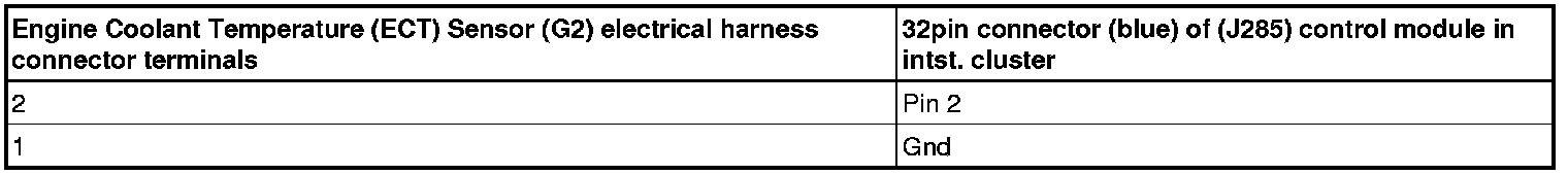 - Using a Multimeter, check the Engine Coolant Temperature (ECT) Sensor ( G2) electrical harness connector terminals to the Motronic Engine Control Module (ECM) (J220) electrical harness connector terminals for an open circuit according to the wiring diagram.