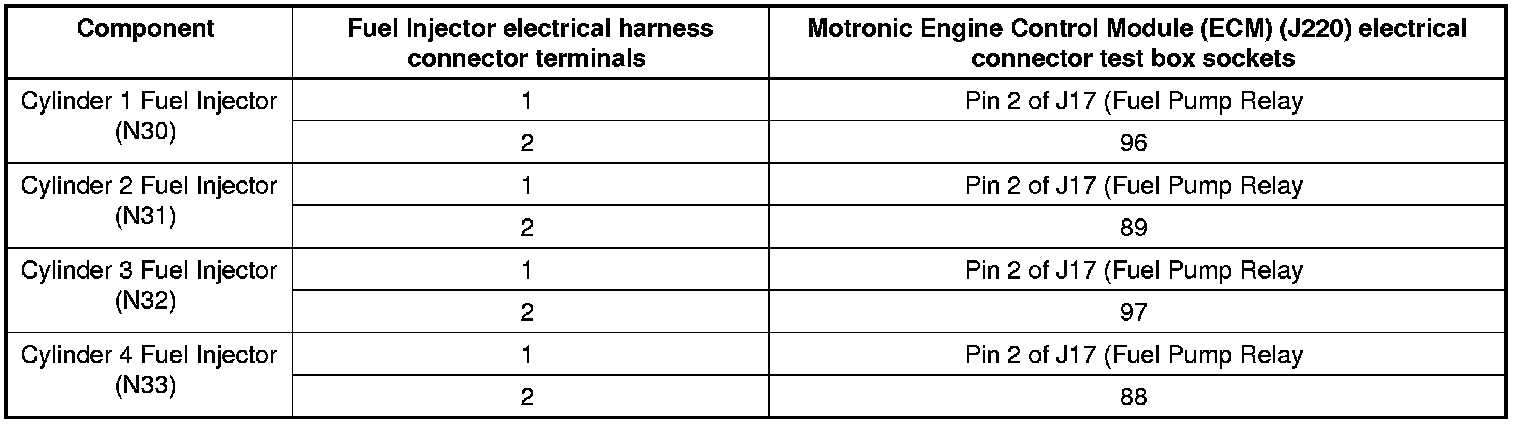 - Using a Multimeter, check the Fuel Injector electrical harness connector terminals to the Motronic Engine Control Module (ECM) (J220) electrical harness connector terminals for an open circuit.