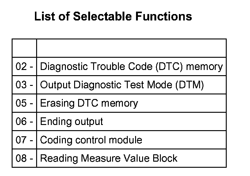 List of Selectable Functions - 01J, Continuously Variable Transmission (CVT)