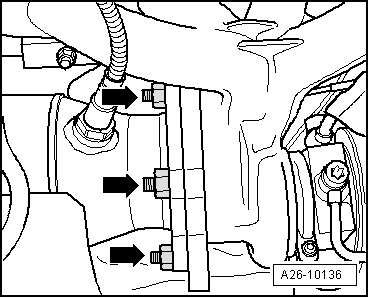 - Remove nuts - arrows - at catalytic converter/turbocharger from above.