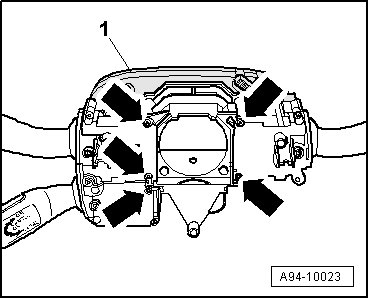 - Carefully release clip fasteners - arrows - and remove spiral spring - 1 - from steering column switch module.