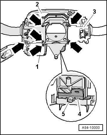 - Remove the Steering Column Electronics Systems Control Module (J527) - 2 - and Windshield Wiper/Washer Switch (E22) - 3 - from steering column switch module.