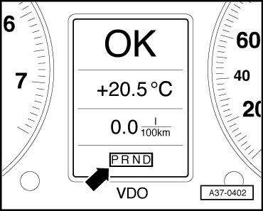 1. The trouble code is stored and a substitute program allows the vehicle to continue to be driven (with some limitations). The driver is not alerted to this condition, since it is not critical to safety nor for the transmission. The transmission range display in the instrument cluster indicates as normal the particular range that has been selected - arrow -. The driver may notice a difference in vehicle driveability and contact an authorized dealer.