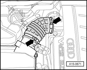 - Remove air guide hose between Mass Air Flow (MAF) Sensor (G70) and Throttle Valve Control Module (J338) by loosening hose clamps - arrows -.