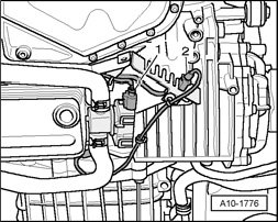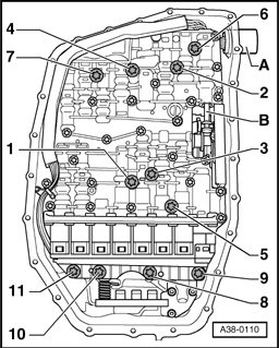 Location: The wiring harness - A - with connector - C - is attached to the mechatronics unit - B -.