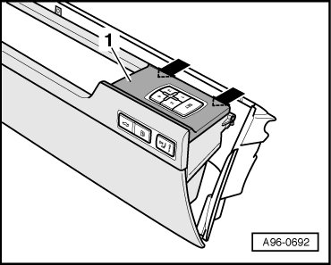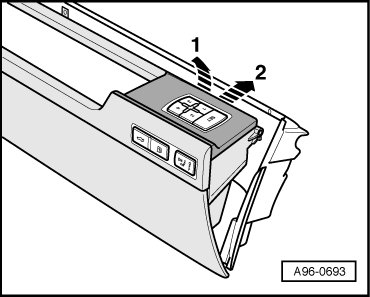 - Lift rear of switch - arrow 1 - and detach towards inside of storage compartment - arrow 2 -.