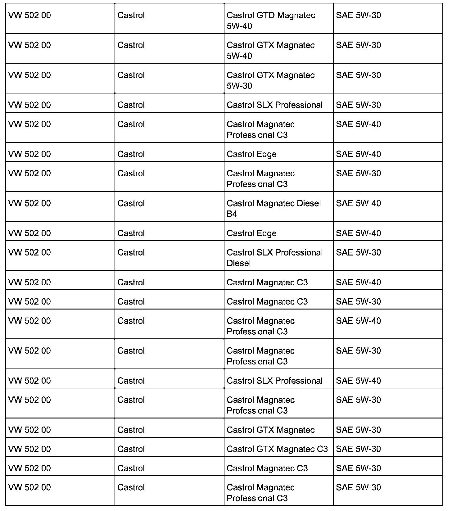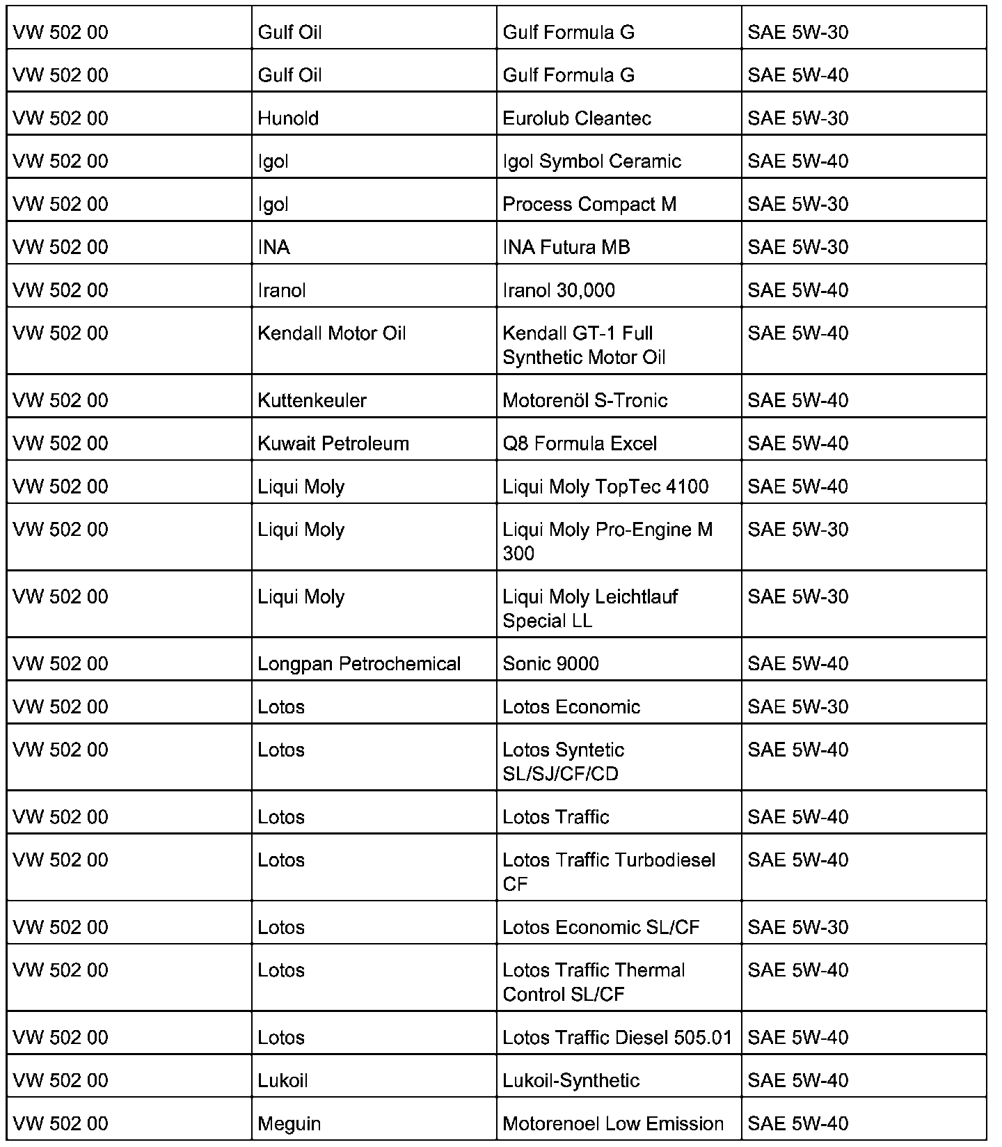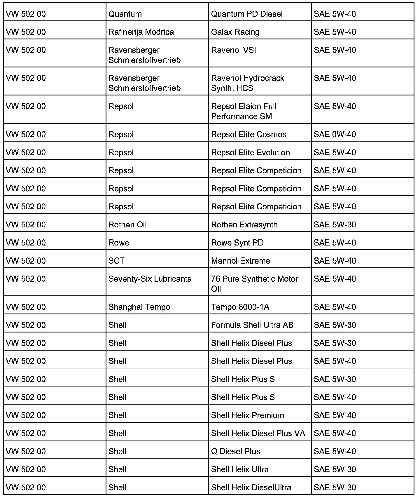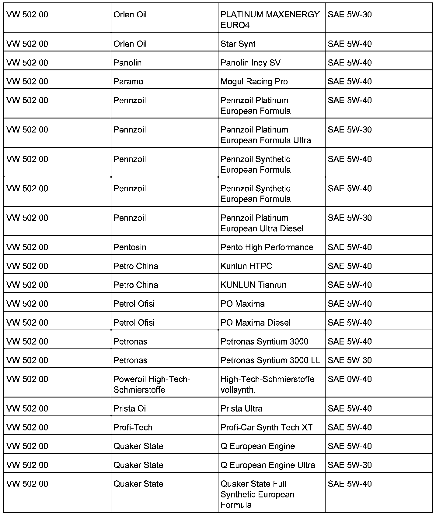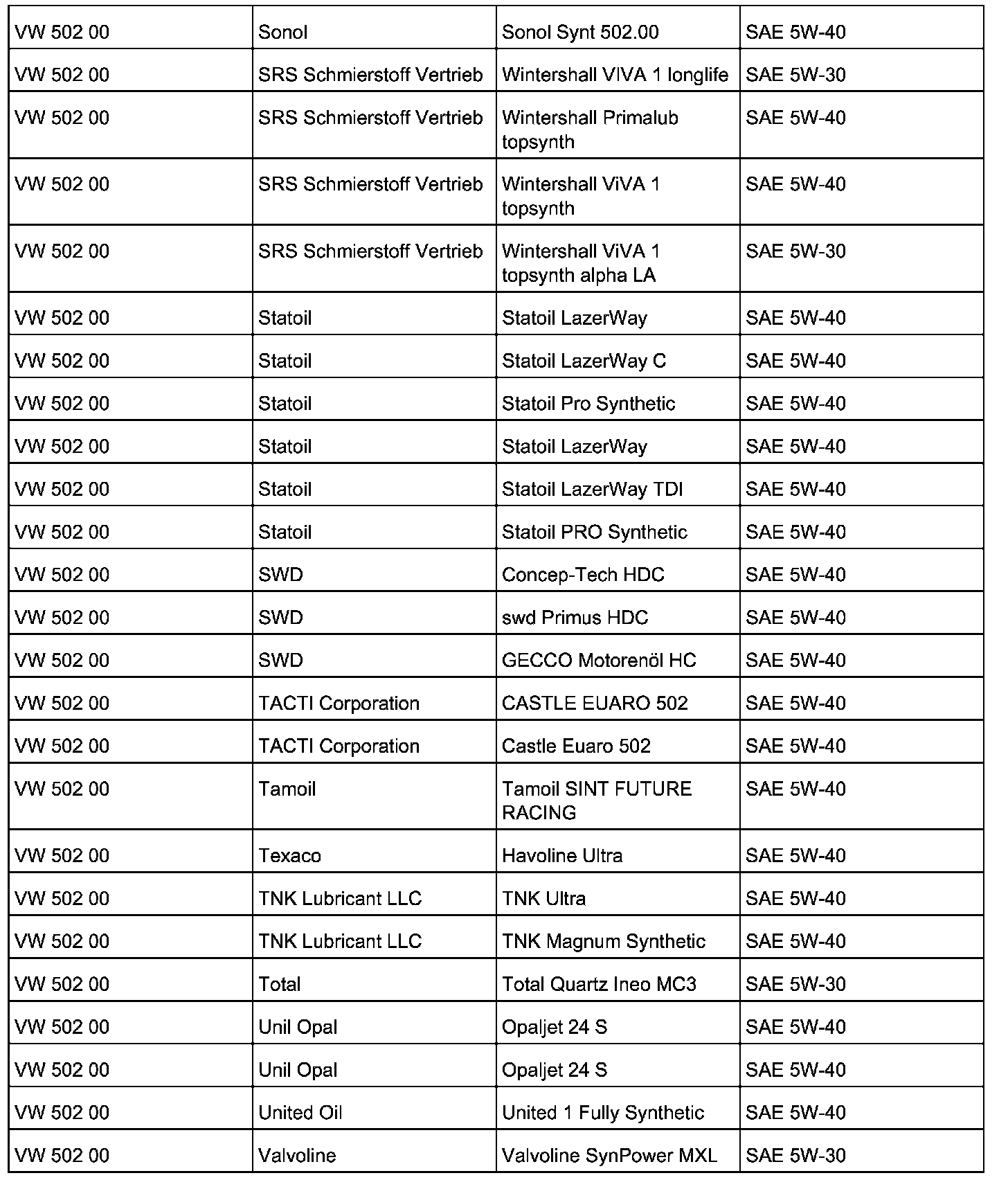 All scheduled Audi Maintenance services must always use engine oil that conforms to Audi Oil Quality Standard VW 502 00. No other engine oils may be used.