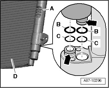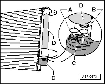• Fluid reservoir - C - and condenser - B - is available in different versions. Reservoirs with only one O-ring were being installed at the start of production - A - and - B -