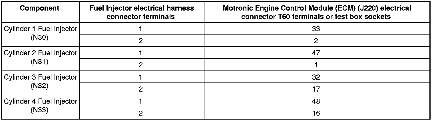 - Using a Multimeter, check the Fuel Injector electrical harness connector terminals to the Motronic Engine Control Module (ECM) (J220) electrical harness connector T60 terminals for an open circuit.