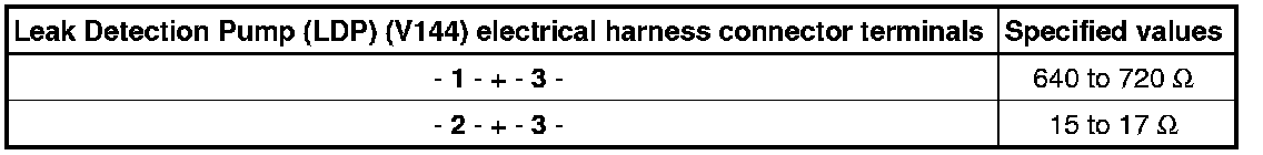 - Using a Multimeter, check the Leak Detection Pump (LDP) (V144) for resistance as follows: