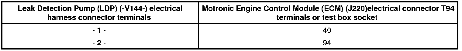 - Using a Multimeter, check the Leak Detection Pump (LDP) (-V144-) electrical connector terminal 1 to Motronic Engine Control Module (ECM) (J220) electrical connector T94 terminal 40 for an open circuit.