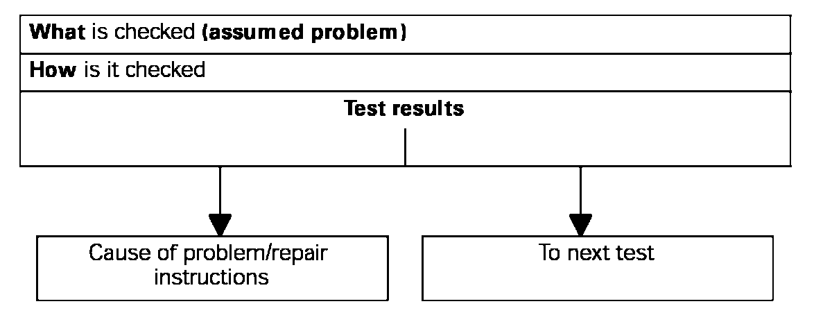 Starting with the reported problem, troubleshooting procedures show step-by-step what is checked and how it is checked in order to find the problem in the quickest and most reliable way. If several causes (of a problem) are possible in one system, a test procedure is used for diagnosis.