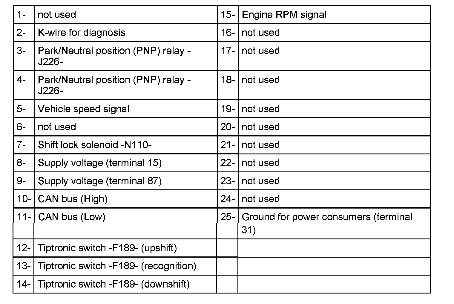Multiple harness connector (25-pin connector) for Transmission control module -J217- (cavities on V.A.G 1598/21):