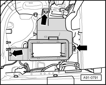 - Remove the screws - arrows - (14 Nm) and remove base mount.
