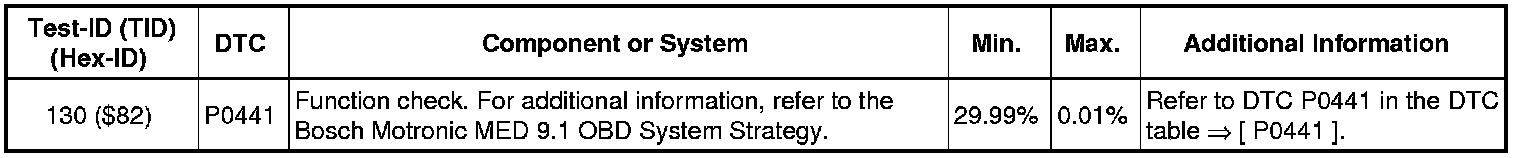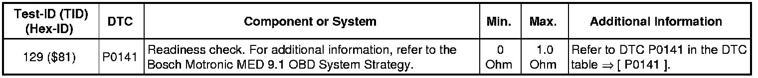 - If any of the components or systems fail to meet the specified values, refer to Diagnostic "Mode 03: Interrogating Fault Memory" to check for stored DTC's or the corresponding diagnostic repair procedure => [ Diagnostic Mode 03 - Read DTC Memory ] Diagnostic Mode 03 - Read DTC Memory.