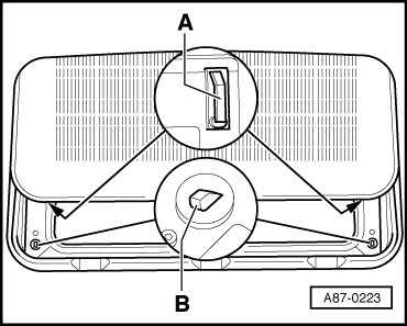 • Solar ventilation function only works when the sunroof is either closed or in the raised position. The solar sunroof converts the solar energy into electrical energy which then passes into the vehicle electrical system via terminals - A - (on the front of the sunroof) and terminals - B - (on the frame of the sunroof).