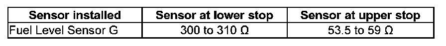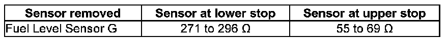 - With fuel level sensor G removed, the following values are obtained because of the greater deflection of the floater arm: