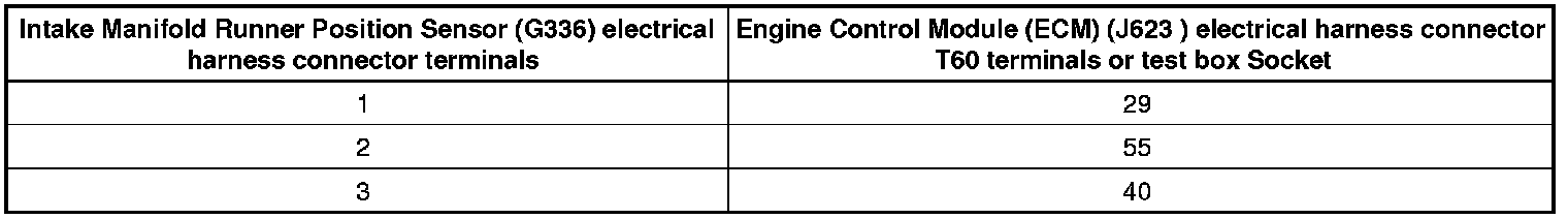 - Using a multimeter, check the Intake Manifold Runner Position Sensor (G336) electrical harness connector terminals to the Engine Control Module (ECM) ( J623) electrical harness connector T60 terminals for an open circuit.