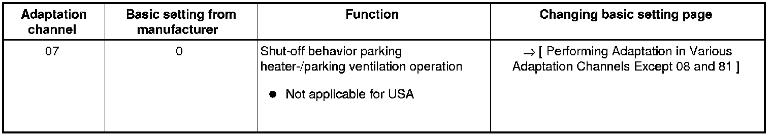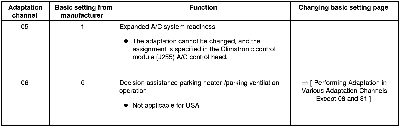 • Adaptation channels "01", "02", "06 ", and "07" are in effect only for vehicles in which a parking heater is installed as optional equipment. In these vehicles, data is exchanged between the Climatronic control module (J255 ) A/C control head the auxiliary heater control module (J364), and the instrument cluster control module (J285) via the comfort data bus system. Not applicable for USA