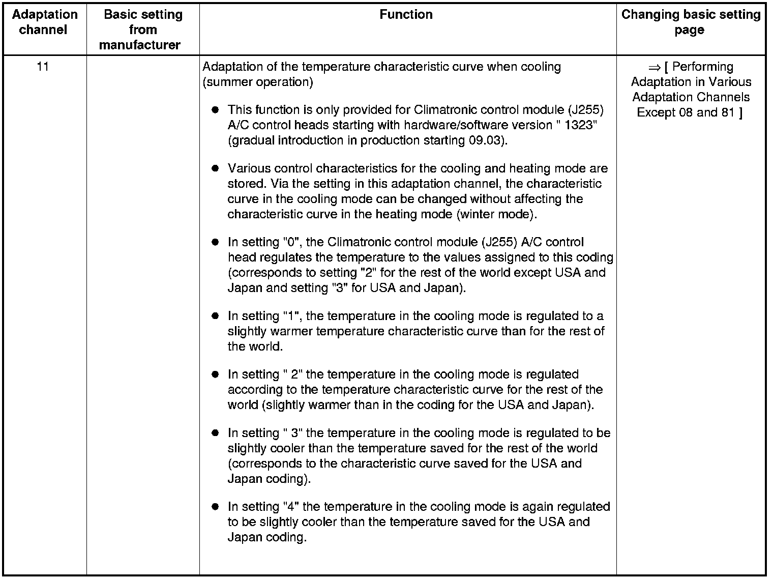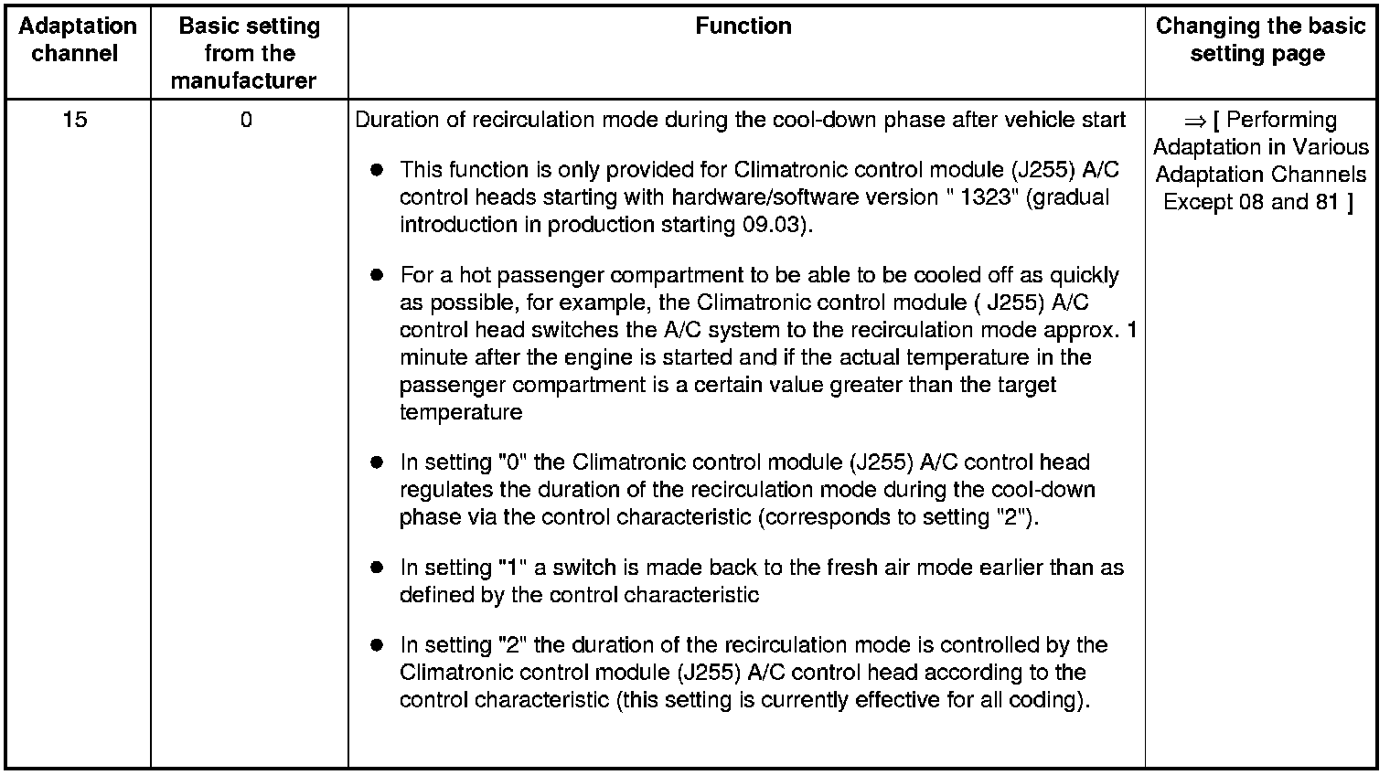 • Adaptation channels "10" through "16" are only provided for a Climatronic control module (J255) A/C control head starting with hardware/software version "1323 " (gradual introduction in production from 09.03).