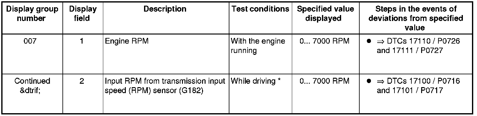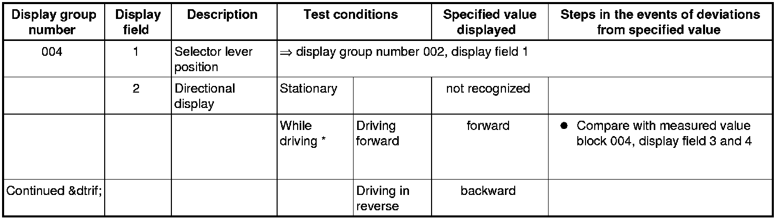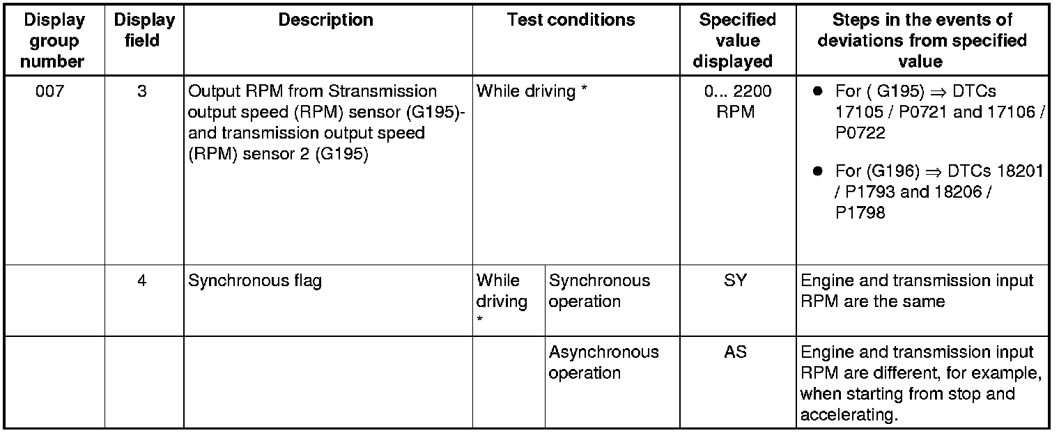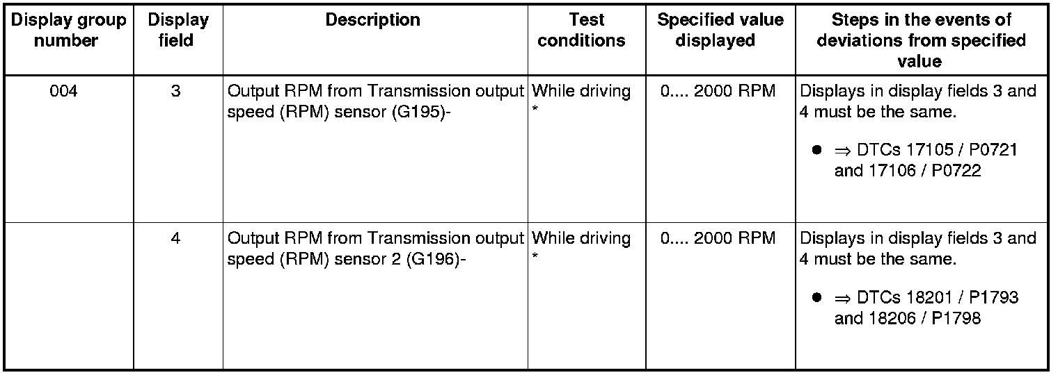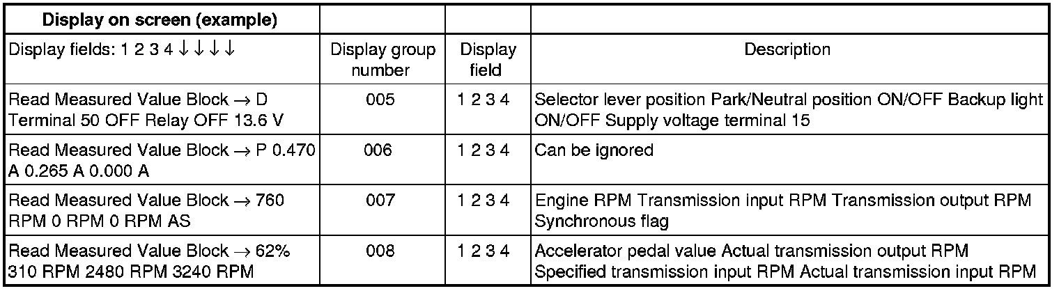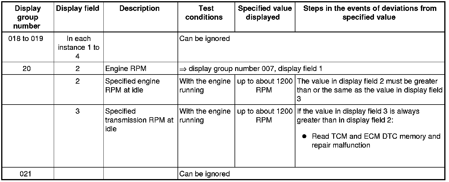If "0 RPM" is shown in display field 3 or 4, the corresponding sender is faulty and the Transmission Control Module (TCM) must be replaced.