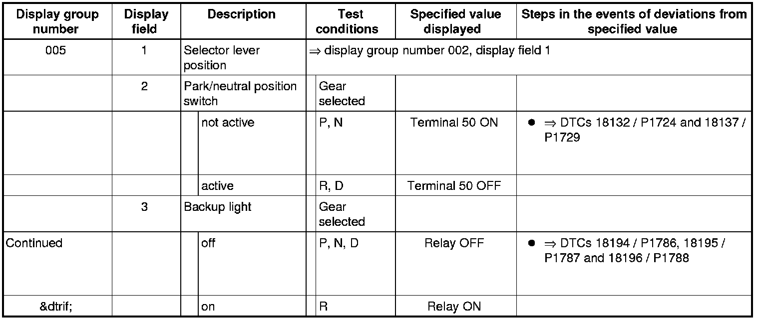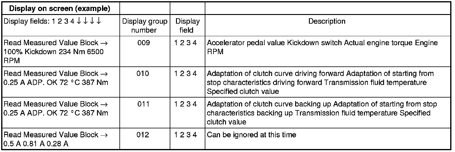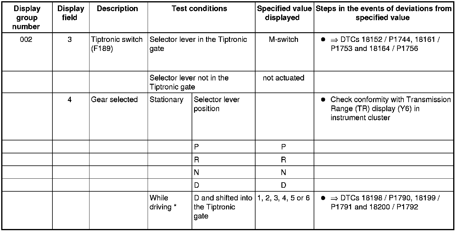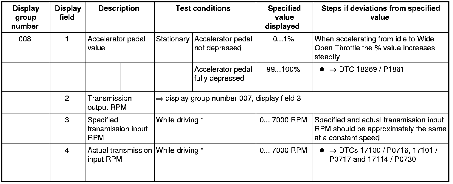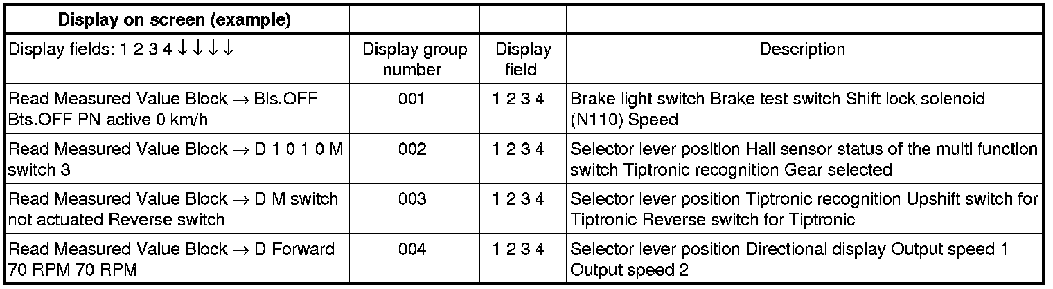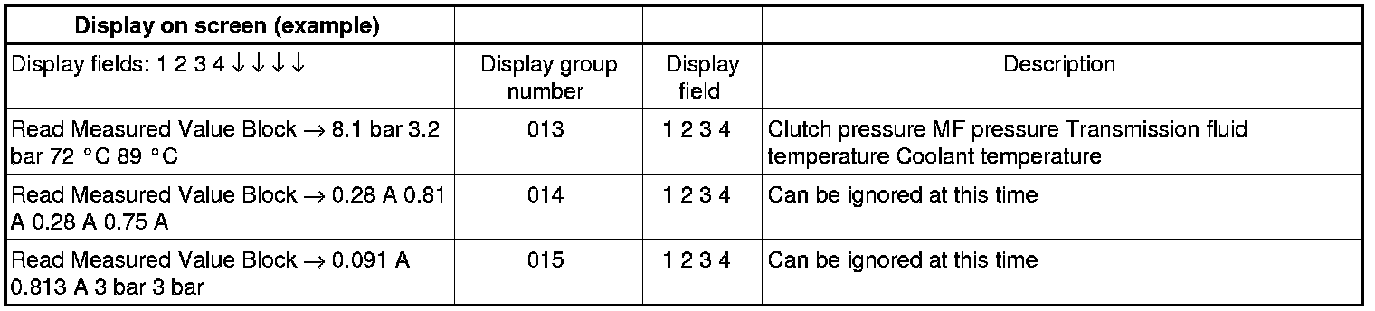If "0 RPM" is shown in display field 3 or 4, the corresponding sender is faulty and the Transmission Control Module (TCM) must be replaced.