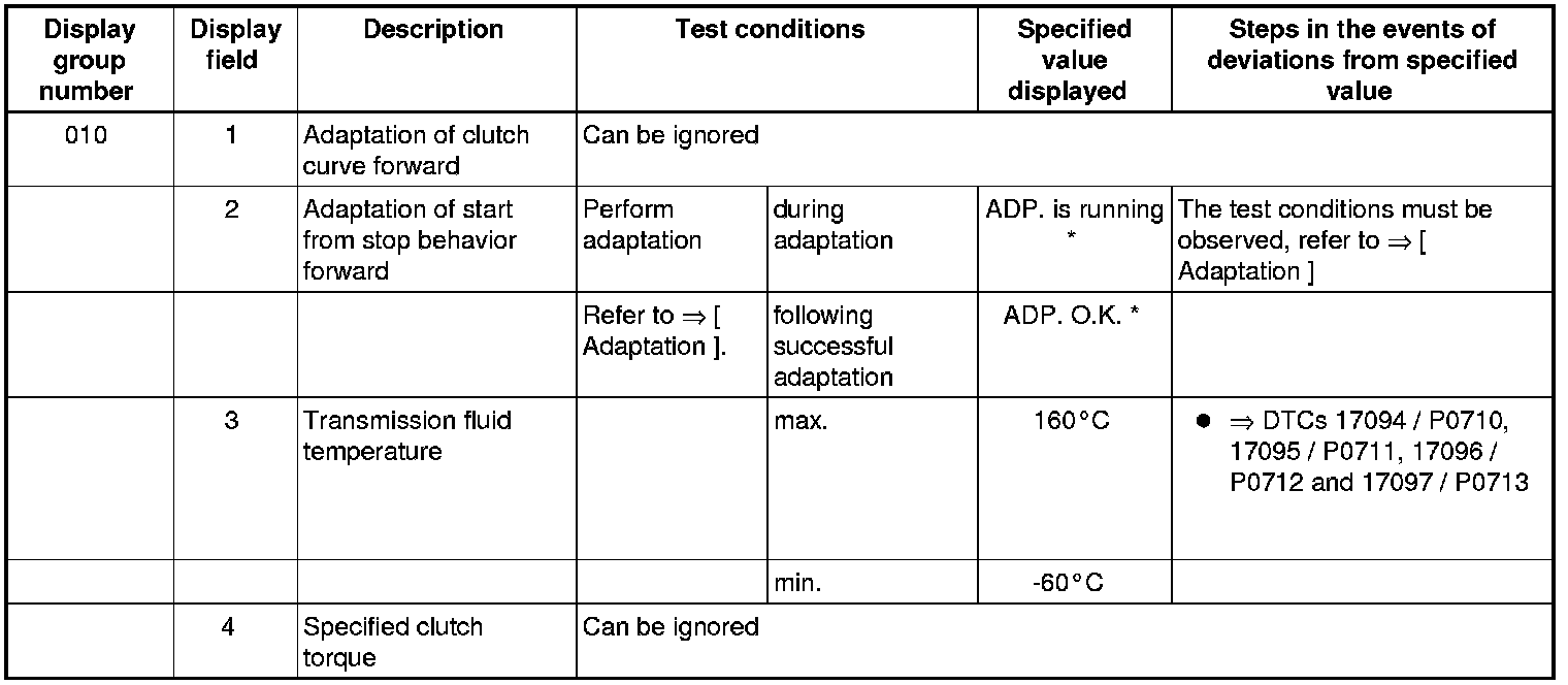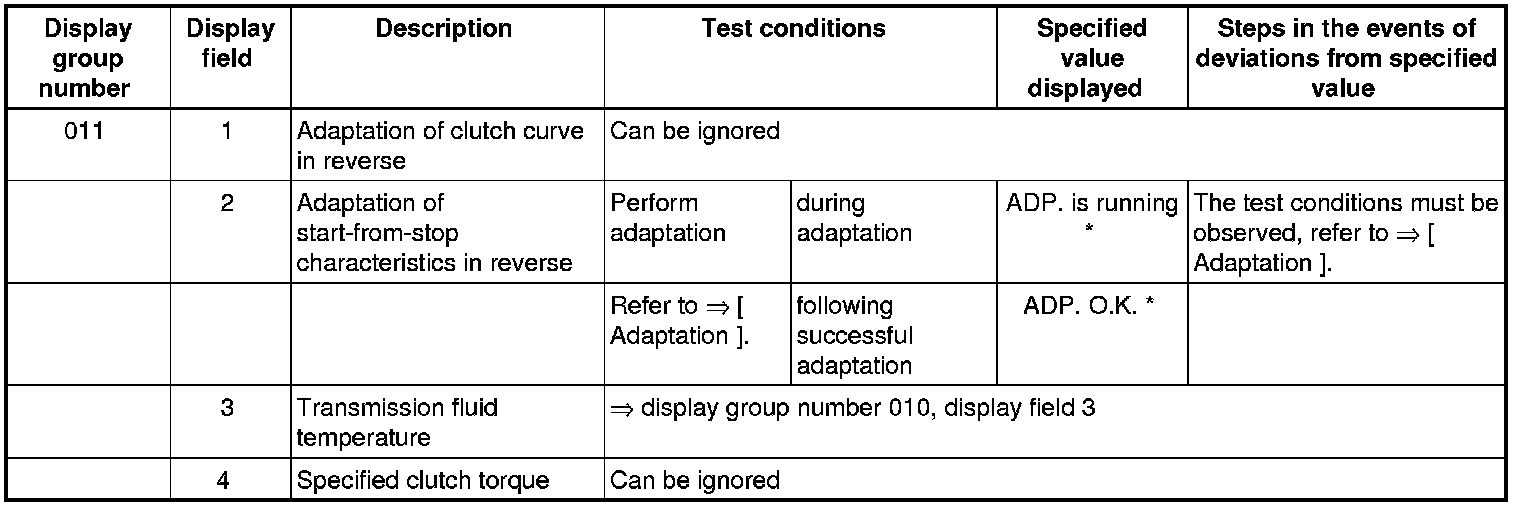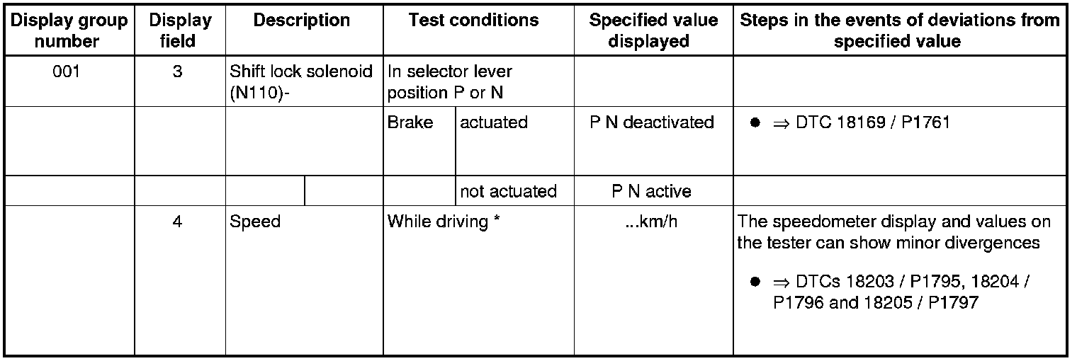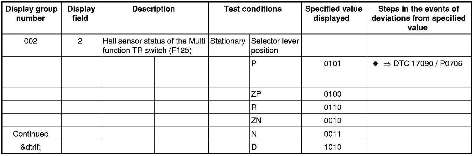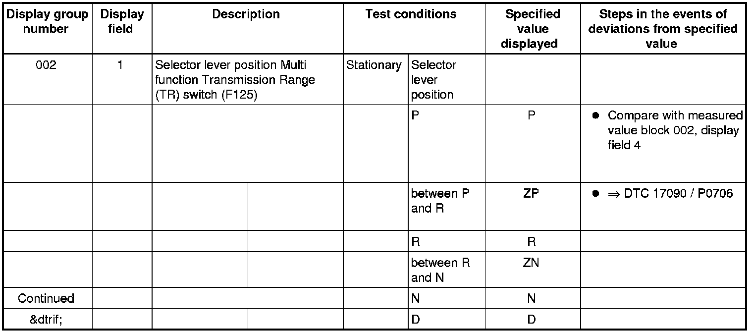 If "0 RPM" is shown in display field 3 or 4, the corresponding sender is faulty and the Transmission Control Module (TCM) must be replaced.
