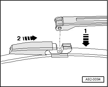 - Insert joint piece of wiper arm into guide on wiper blade - arrow 1 -; make sure that the joint piece is inserted completely into guide.