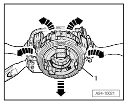 - Carefully release clip fasteners - arrows - and remove spiral spring - 1 - from steering column switch module.