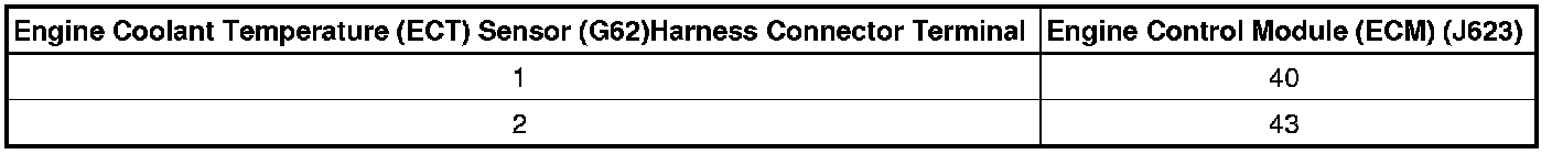- Using a Multimeter, check the Engine Coolant Temperature (ECT) Sensor (G62) electrical harness connector terminals to the Engine Control Module (ECM) (J623) electrical harness connector terminals for resistance.