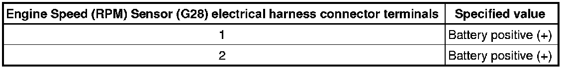 - Using a multimeter, check the Engine Speed (RPM) Sensor (G28) terminals1 to 2 for resistance.