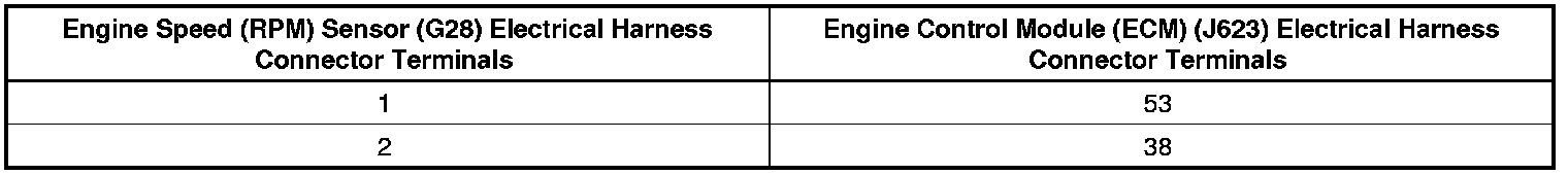 Using a Multimeter, check the Engine Speed (RPM) Sensor (G28) electrical harness connector terminals to the Engine Control Module (ECM) (J623) electrical harness connector terminals for resistance.