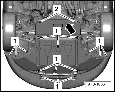- Remove rear noise insulation by loosening the fasteners - 2 - and, if equipped, - arrow -.