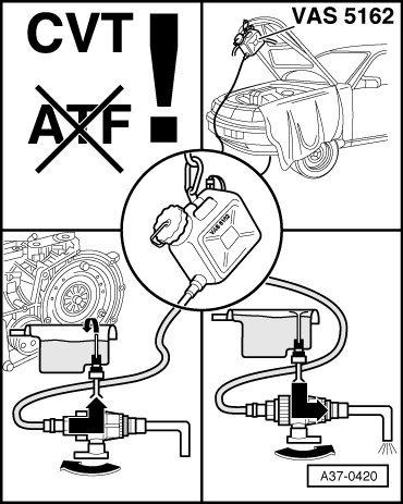 • The illustration on the reservoir for ATF filler system F/CVT transmission (VAS 5162) in upper left graphic refers to the use of special ATF for CVT transmissions.