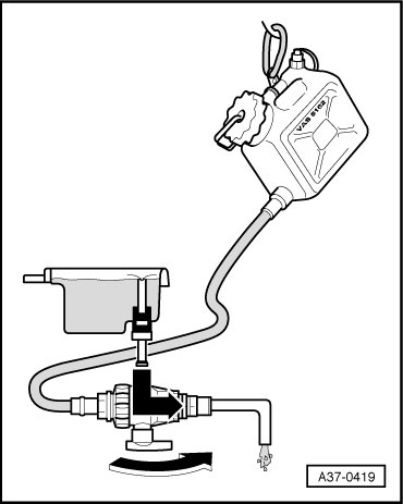 - Rotate shut-off valve in direction of filler hose - lower arrow -. ATF flows into transmission.