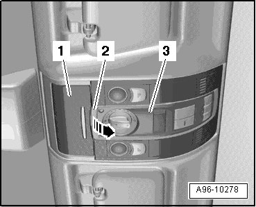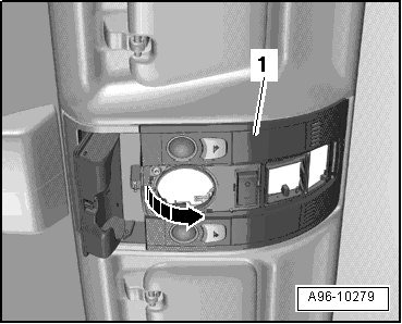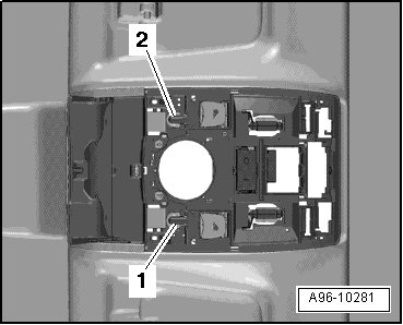 - Open eyeglass compartment - 1 - and release center covers - 2 - and - 3 - of interior/reading light - arrow -.