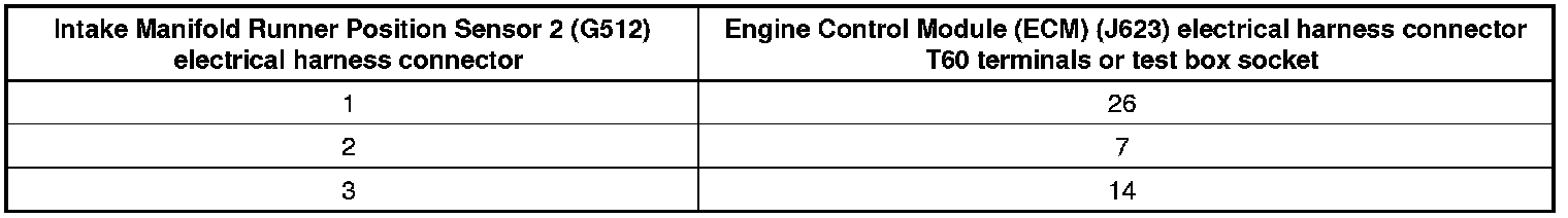 - Using a multimeter, check the Intake Manifold Runner Position Sensor 2 (G512) electrical harness connector terminals to the Engine Control Module (ECM) (J623) electrical harness connector T60 terminals for an open circuit.