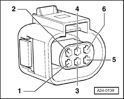 - Using a Multimeter , check the Throttle Drive (for Electronic Power Control (EPC)) G186 at the Throttle Valve Control Module J338 electrical harness connector terminals 2 to 6 for voltage.