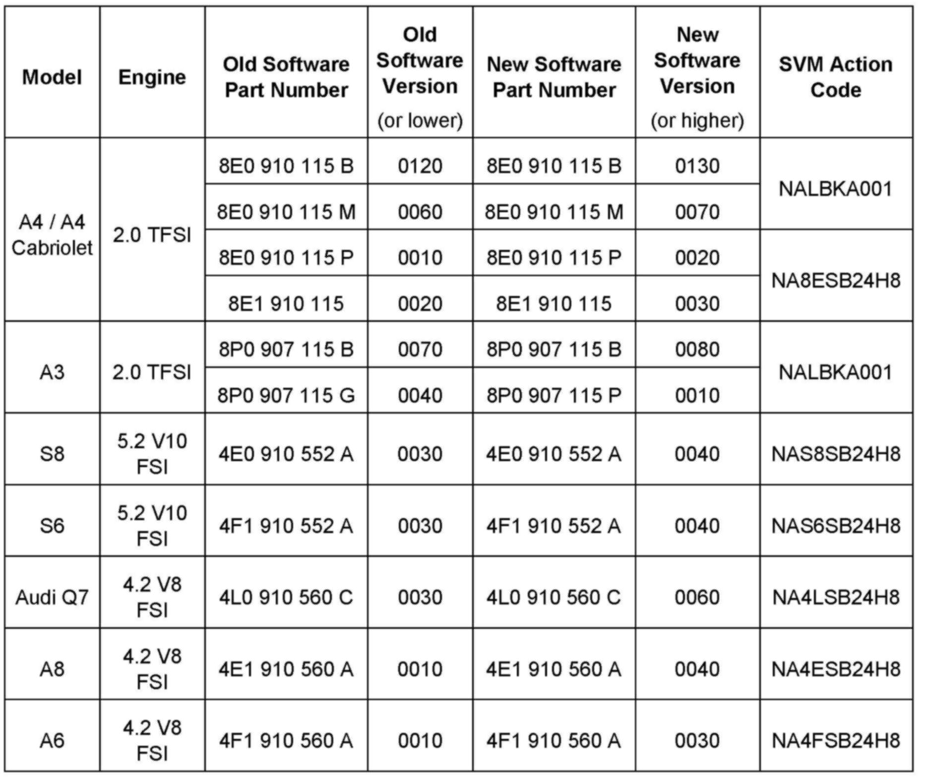 2. Update the ECM software of the affected vehicles (two ECMs for RS4, S6 and S8) using the SVM action codes listed in the table above.