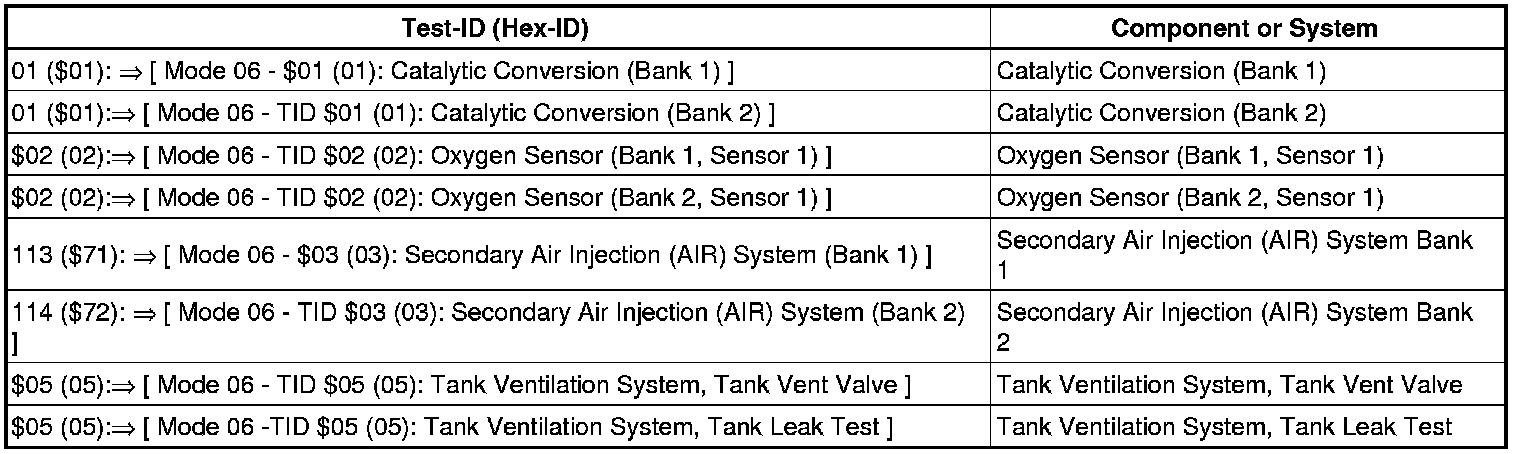 • Depending on the scan tool and protocol used, the information displayed in diagnostic mode 06 may be referred to by different names such as Test-ID (TID), Hex-ID, Component-ID (CID), or On-Board Diagnostic Monitor Identifier (OBDMID).