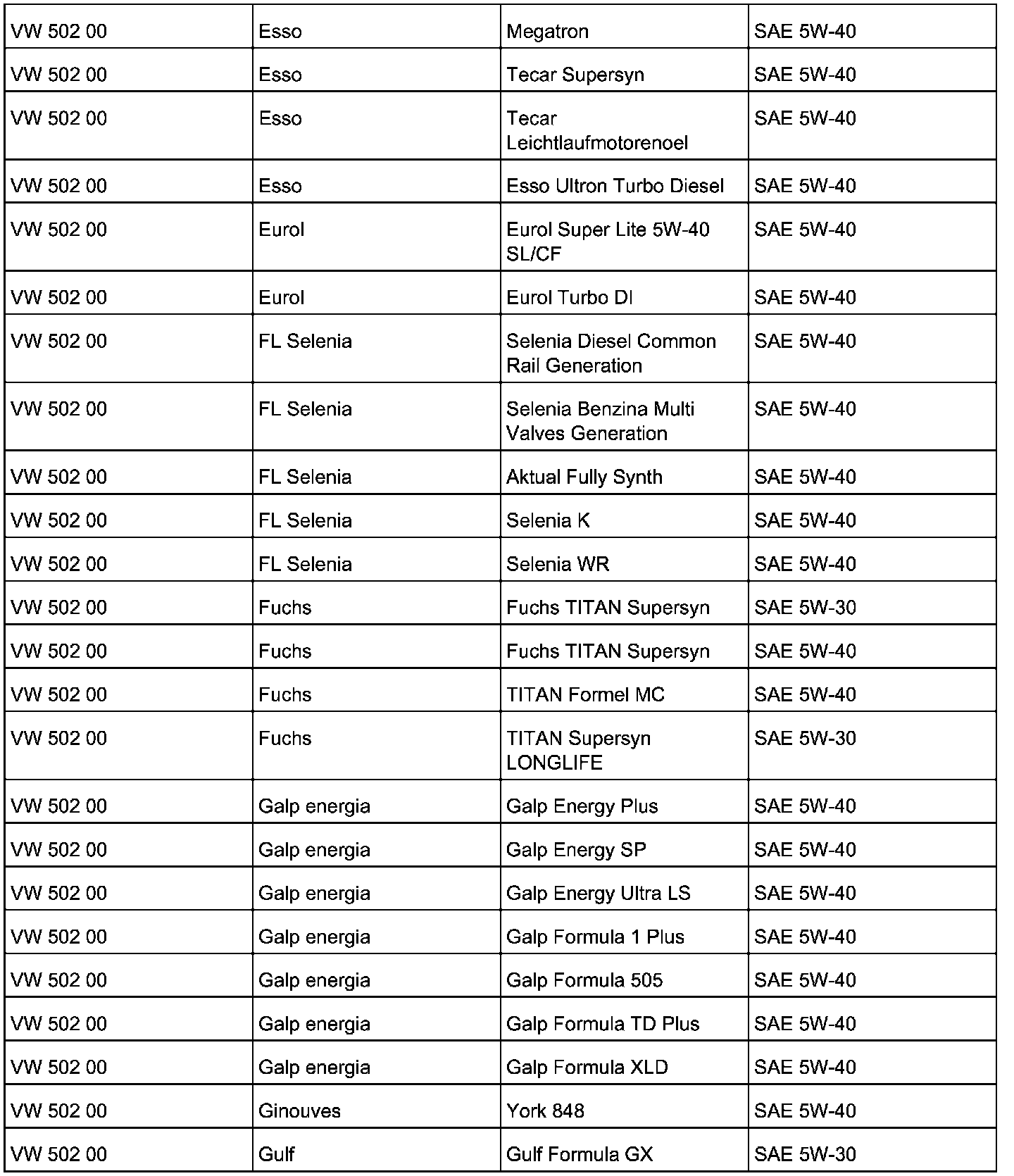From model year 2005, all Audi engines must always use engine oil that expressly conforms to Audi Oil Quality Standard VW 502 00 (with viscosities of SAE 5W-40, 5W-30, 0W-40).