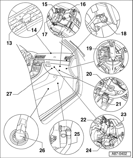 NOTE: The following illustrations show a instrument panel of the type installed in a Saloon or Avant up to VIN 399999 in Model Year 2005. The shape of the instrument panel on a Cabrio or for a Saloon or Avant as of VIN 400000 in Model Year 2005 (for Saloon and Avant; gradual introduction for the Cabrio in week 46/04 without prior specification of any particular VIN) differs slightly from these illustrations.