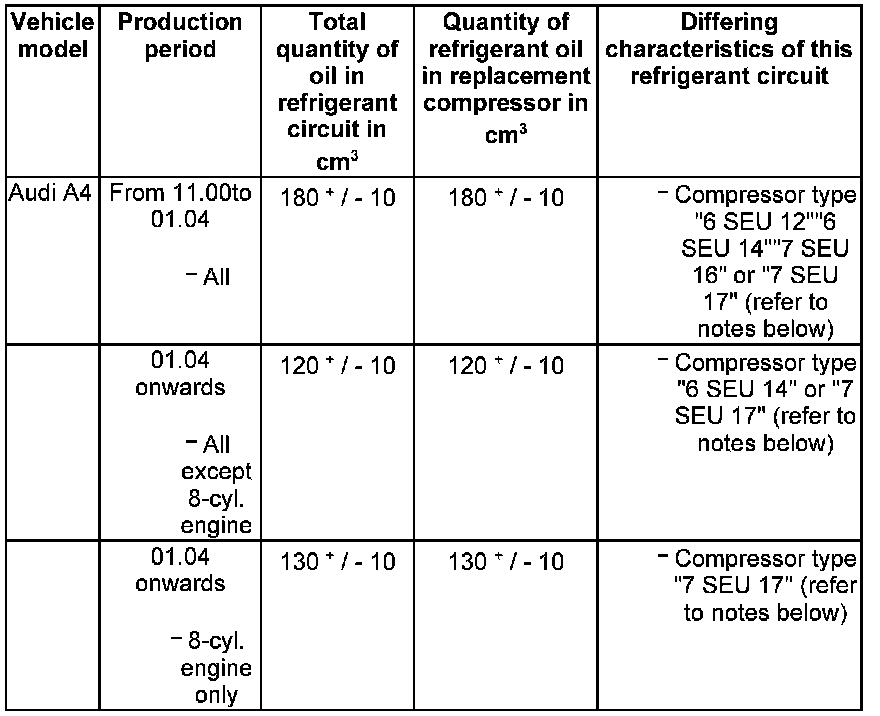 - At the start of production, the compressor types in the first line of the table were supplied with a refrigerant oil quantity of 180 cu.cm. These compressors can be recognized from the index of the part number (8E0 260 805 with one index or with double index up to "AH"). In Model Year 2004 (as of approx. 01.04), a gradual change was made to other types of compressor with a refrigerant oil quantity of 120 cu.cm or 130 cu.cm. These compressors can be recognized from the index of the part number 8E0 260 805 (with double index as of " AJ") or 4F0 260 805 (and index "E" for vehicles with 8-cyl. engine) Parts List .