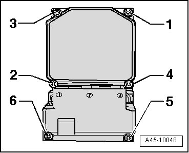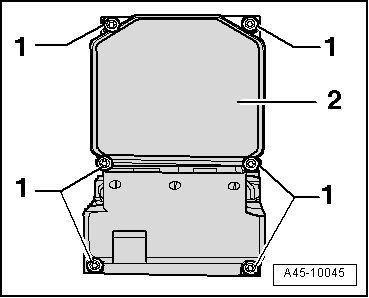 - Press control module onto hydraulic assembly and evenly install new bolts - 1 - and - 2 - (do not tighten) until module evenly contacts ABS Hydraulic Unit (N55).